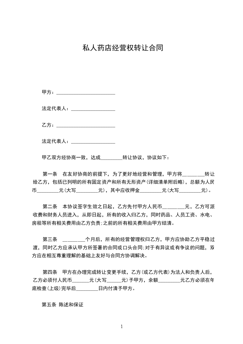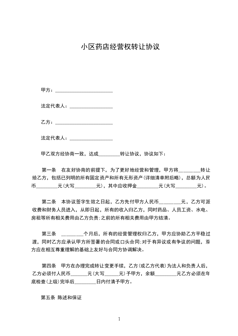 二、乙方在 年 月 日前向甲方支付转让费共计人民币 ,(大写: ),上述费用已包括 (经营许可证等证照、药品、货柜、货架、经营执照、文件柜、办公桌、电脑、指纹机、中药柜、单人床等),此外甲方不得再向乙方索取任何其他费用。