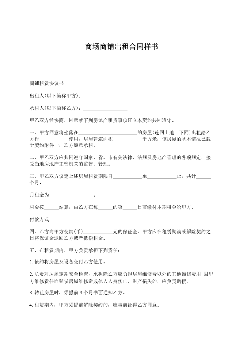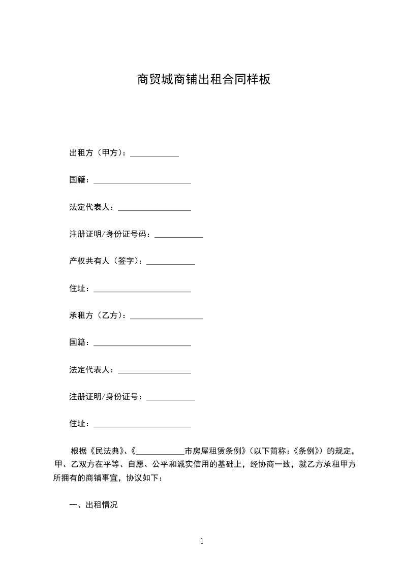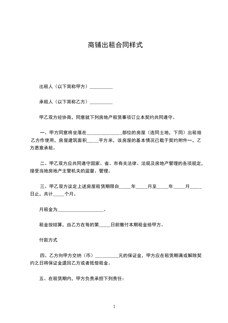 第一条租赁商铺广场(以下统称“商铺”),租赁面积约:__________________平方米(乙方同意不就租用面积与政府测绘或其他组织个人测量面积有出入而进行任何租金调整)。