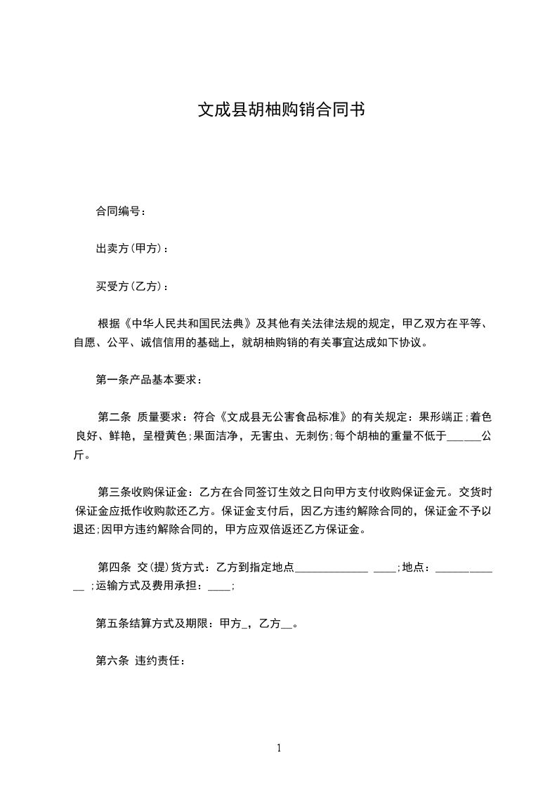 根据《中华人民共和国民法典》及其他有关法律法规的规定,甲乙双方在平等、自愿、公平、诚信信用的基础上,就胡柚购销的有关事宜达成如下协议。