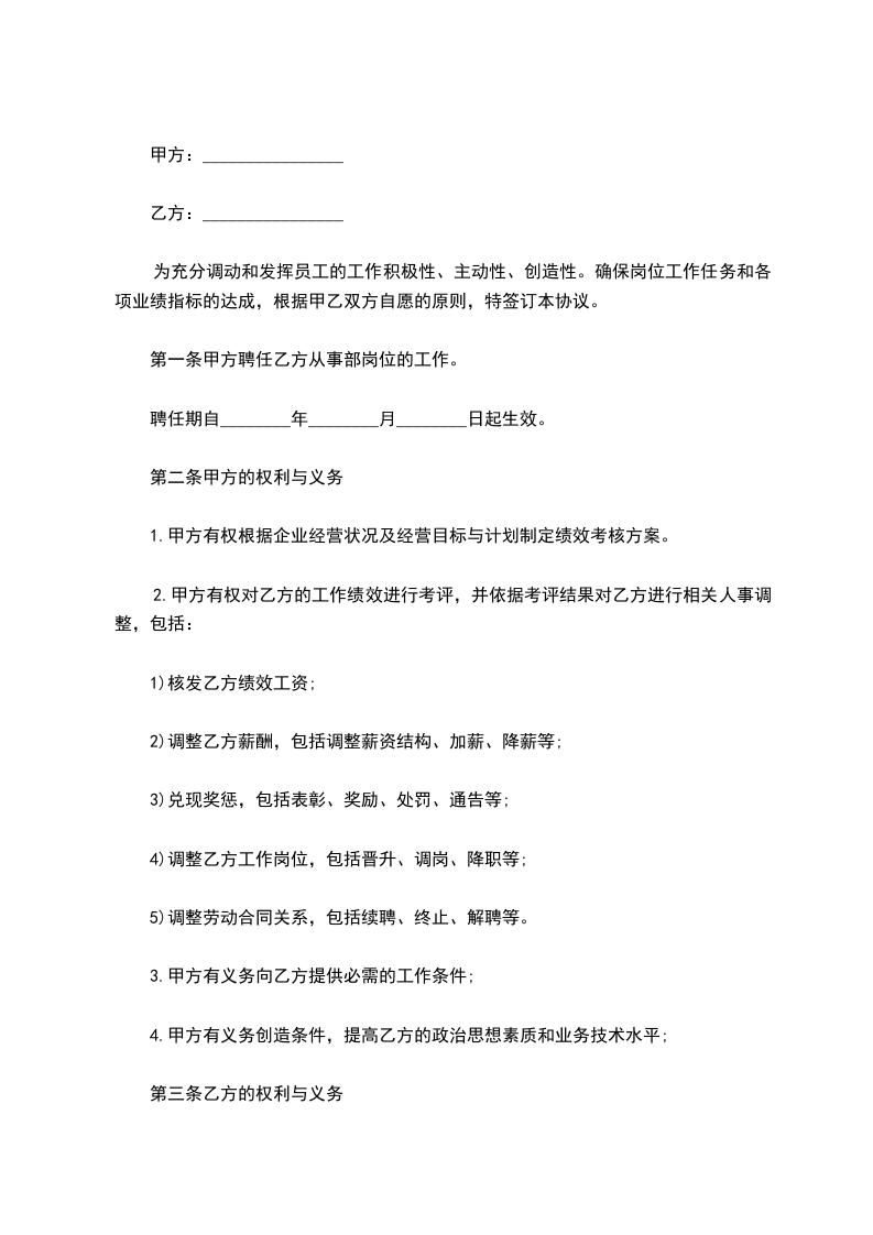 为充分调动和发挥员工的工作积极性、主动性、创造性。确保岗位工作任务和各项业绩指标的达成,根据甲乙双方自愿的原则,特签订本协议。