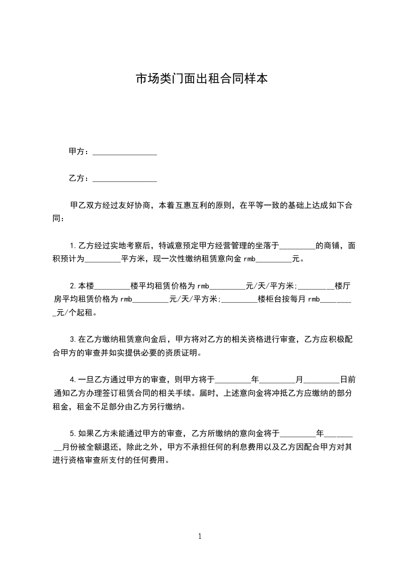 1.乙方经过实地考察后,特诚意预定甲方经营管理的坐落于_________的商铺,面积预计为_________平方米,现一次性缴纳租赁意向金rmb_________元。