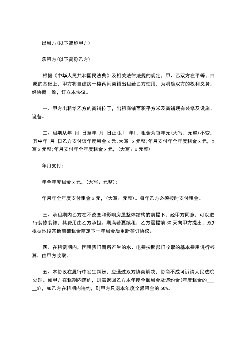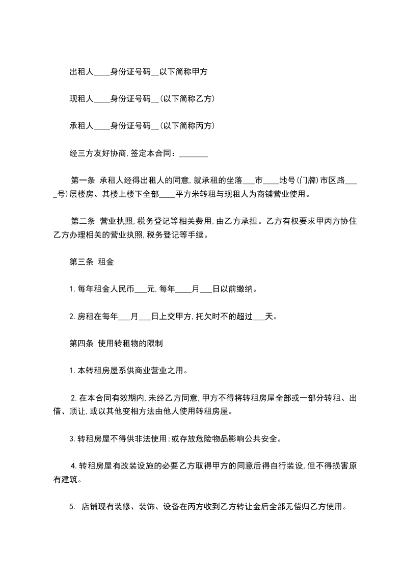 一、转让门面转让门面位于_______________,建筑面积__________平方米;丙方为上述转让门面的所有权人和出租方。现对甲、乙双方根据本合同约定转让上述门面承租权的行为,丙方表现同意。原甲、丙双方所签门面租赁合同的权利与义务转由乙方享有和履行,乙方与丙方不再另行签订租赁合同。本合同生效和门面交接完毕后,甲、丙双方之间原门面租赁合同终止履行,权利义务自行解除。