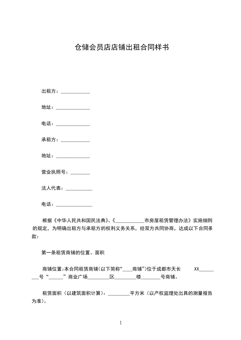 商铺位置:本合同租赁商铺(以下简称“____商铺”)位于成都市天长XX_________号“______”商业广场_________区_________楼________号商铺。