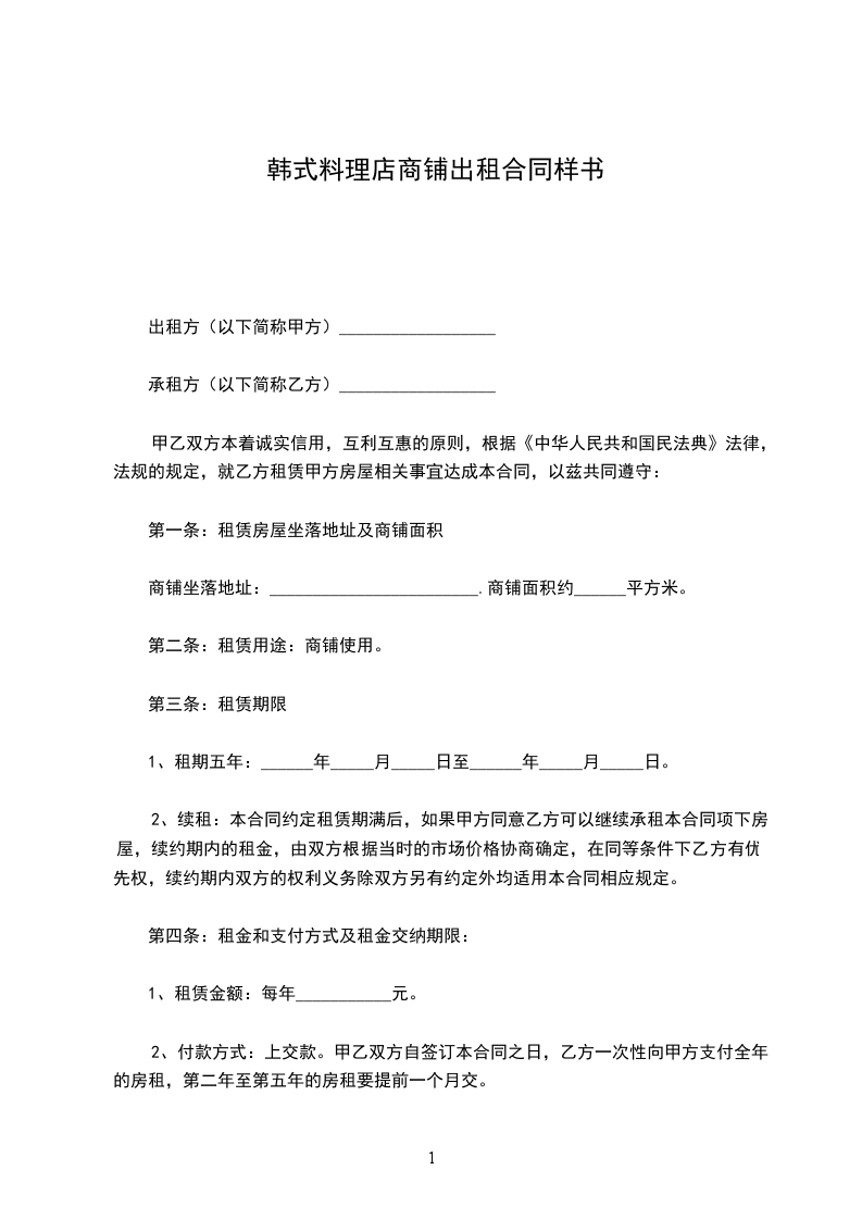 1、每年租金为人民币_______________,大写:__________元整。