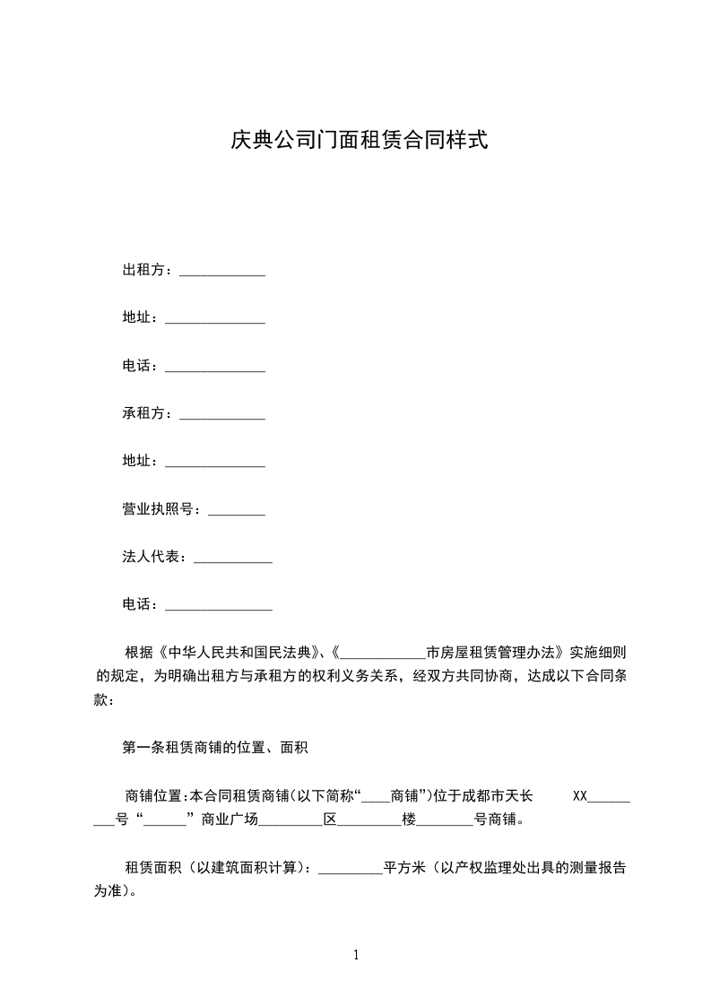 商铺位置:本合同租赁商铺(以下简称“____商铺”)位于成都市天长XX_________号“______”商业广场_________区_________楼________号商铺。