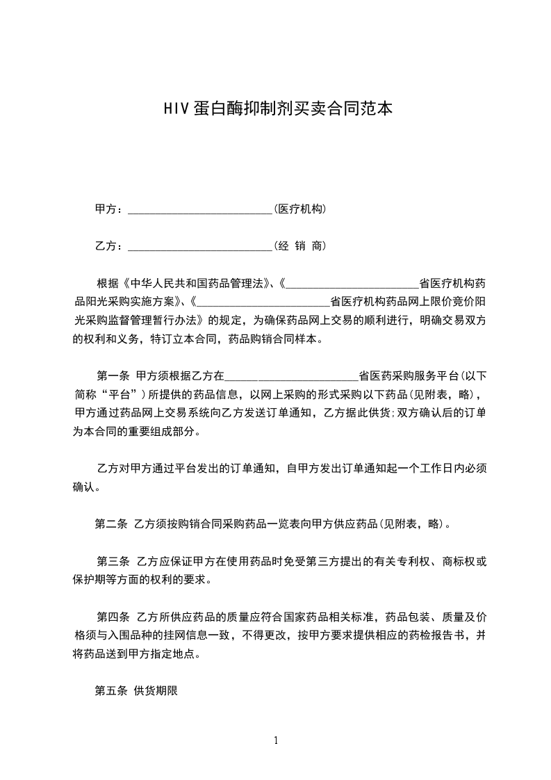 第一条 甲方须根据乙方在________________________省医药采购服务平台(以下简称“平台”)所提供的药品信息,以网上采购的形式采购以下药品(见附表,略),甲方通过药品网上交易系统向乙方发送订单通知,乙方据此供货;双方确认后的订单为本合同的重要组成部分。