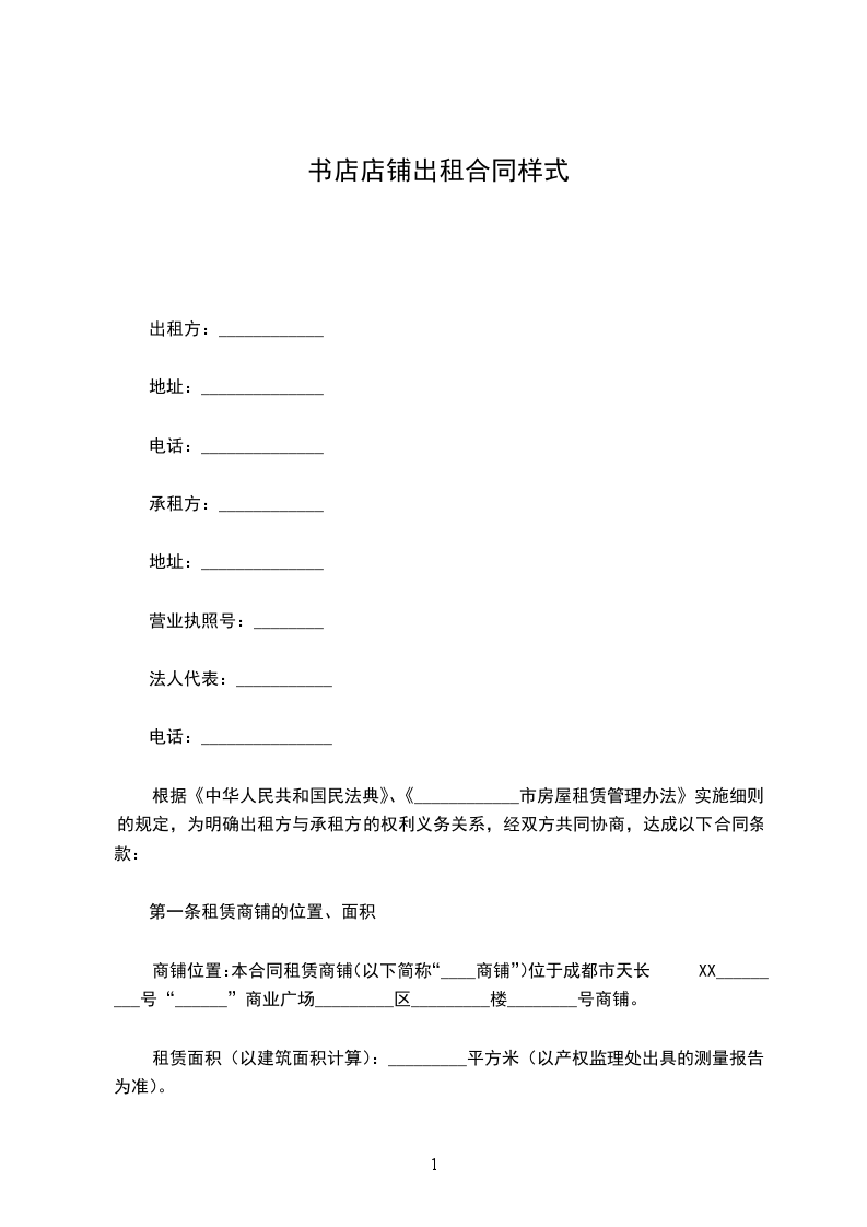 商铺位置:本合同租赁商铺(以下简称“____商铺”)位于成都市天长XX_________号“______”商业广场_________区_________楼________号商铺。