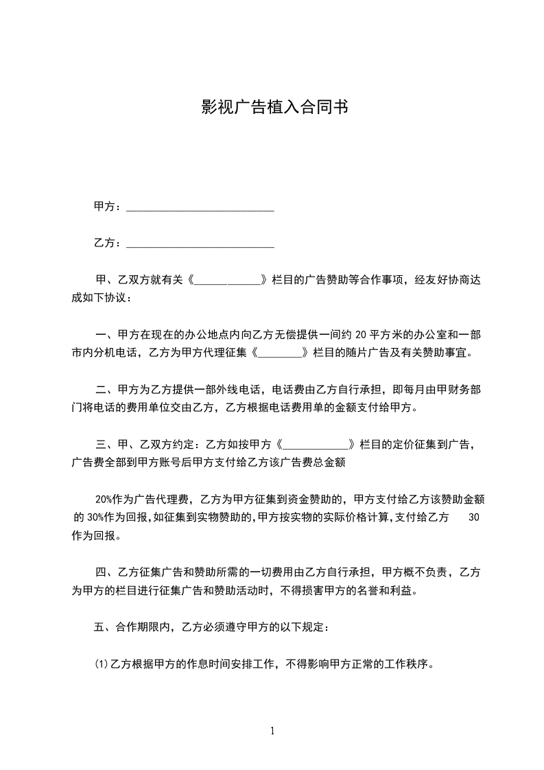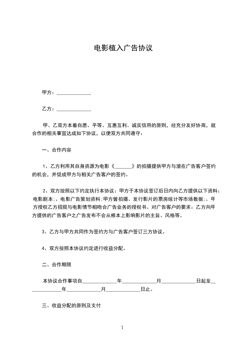 1、乙方利用其自身资源为电影《xxxx》(以下简称为“电影”)的拍摄提供甲方与潜在广告客户签约的机会,并促成甲方与相关广告客户的签约。