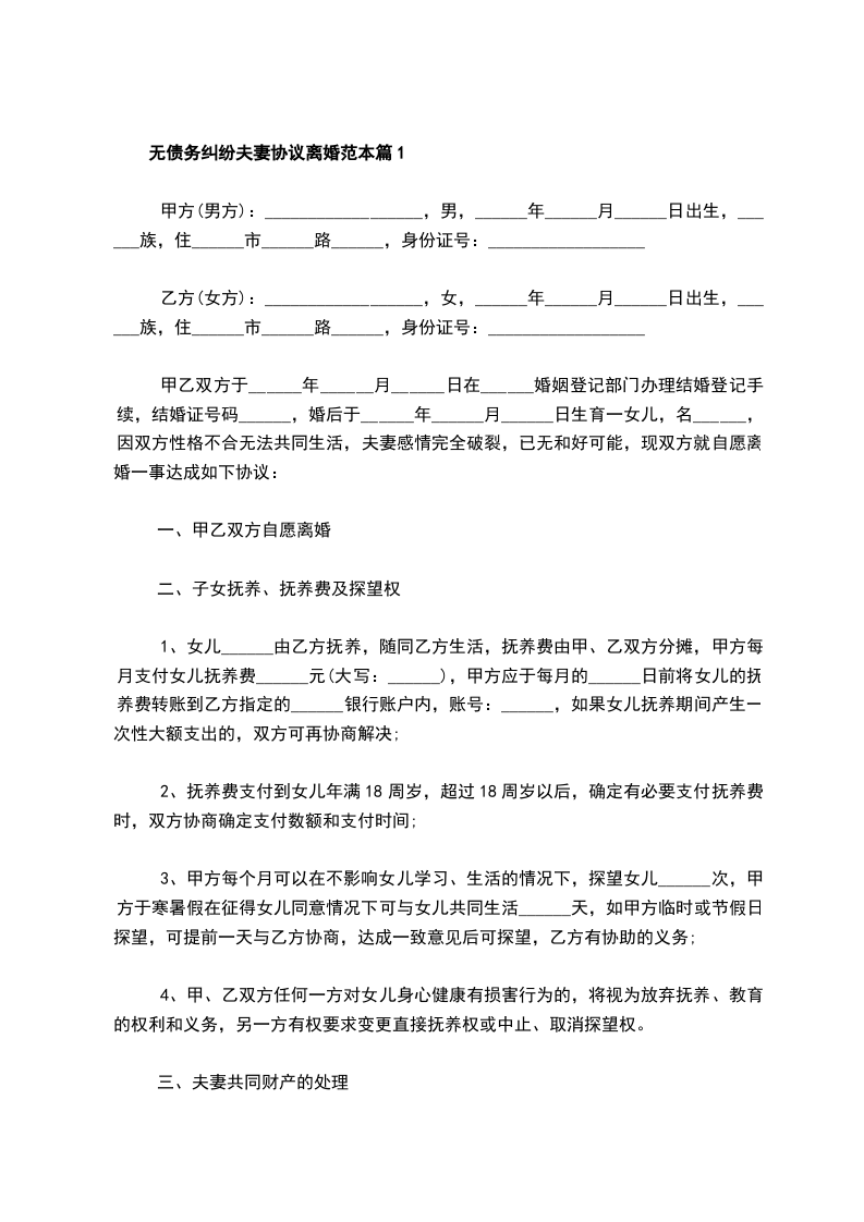 无债务纠纷离婚协议书参考样本篇2