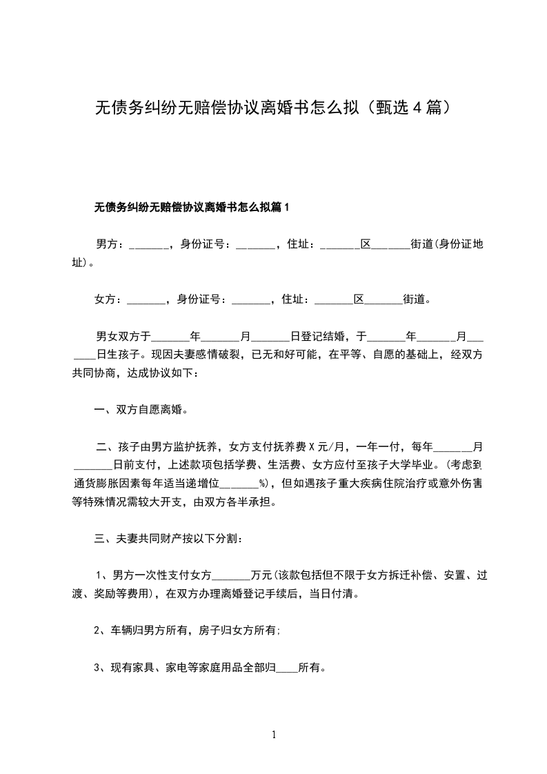无债务纠纷离婚协议书参考样本篇1