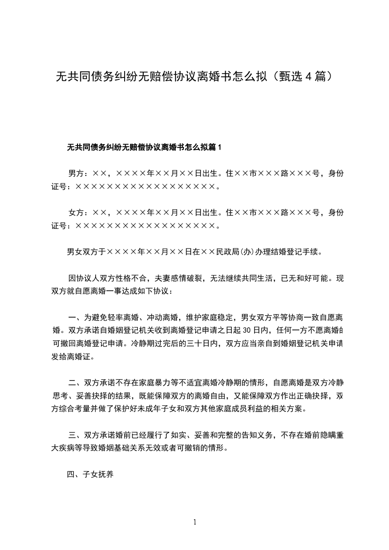 1、甲乙双方确认在婚姻关系存续期间无共同债务;
