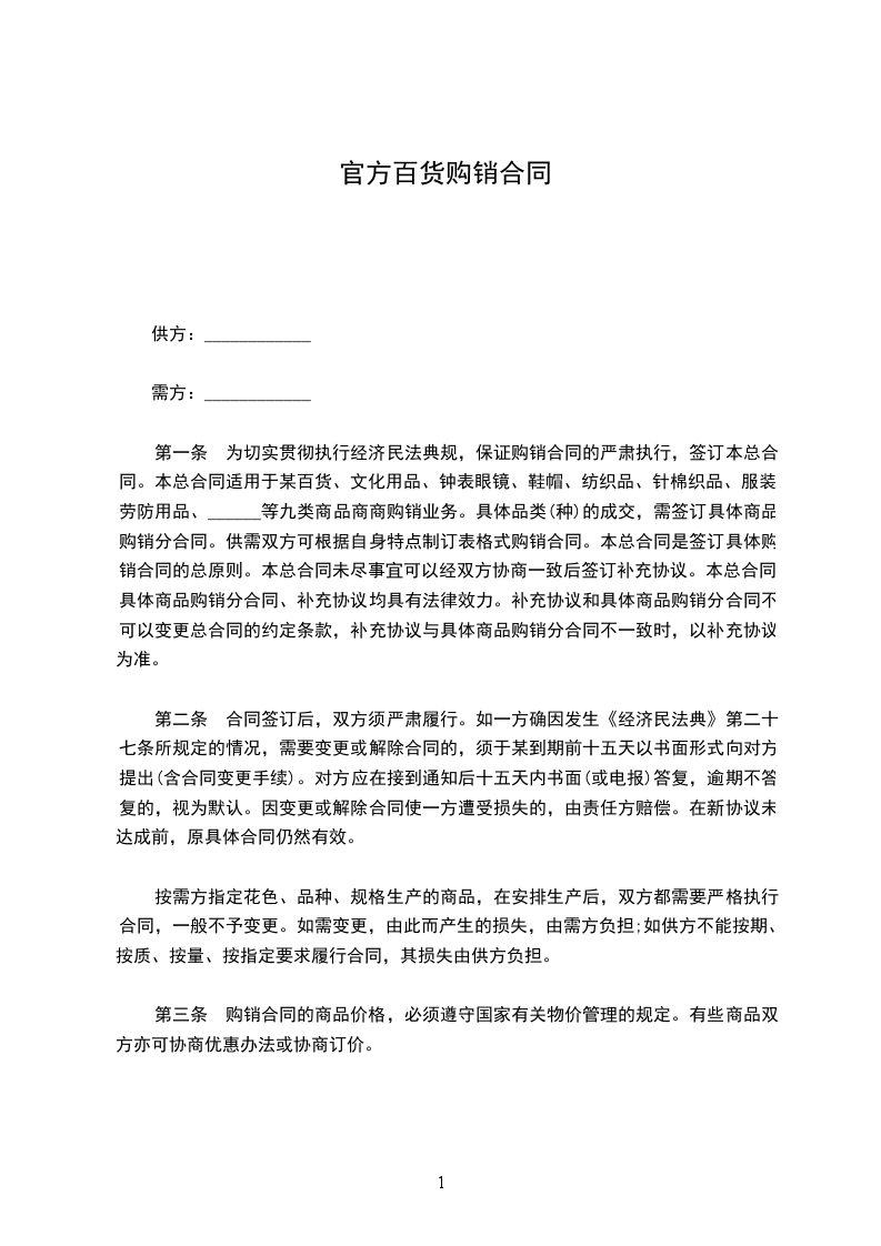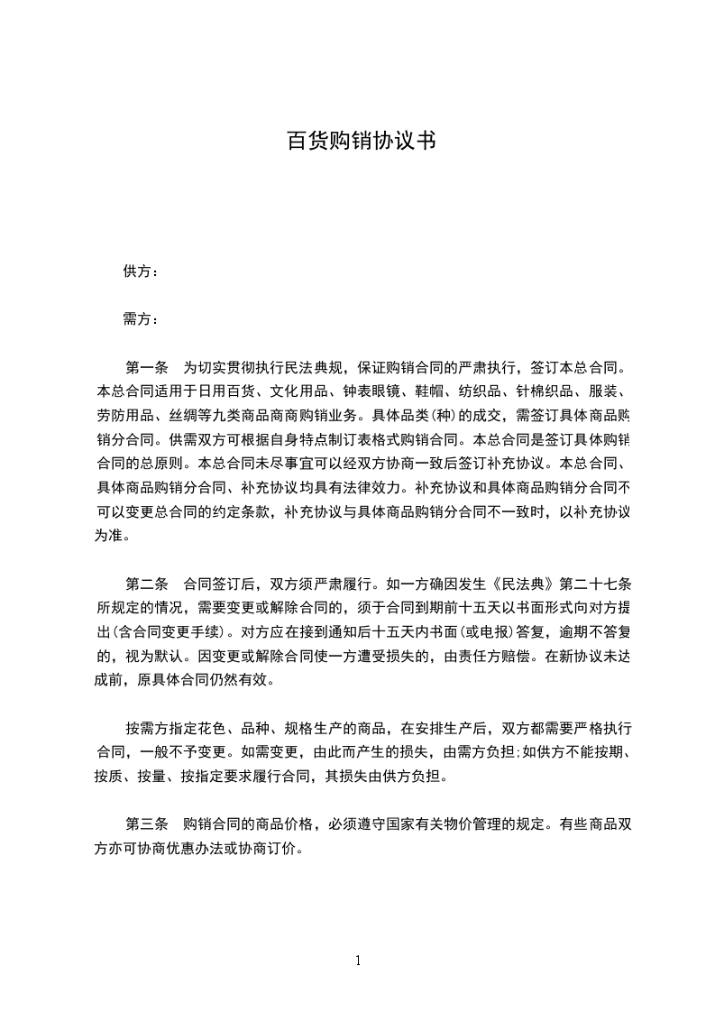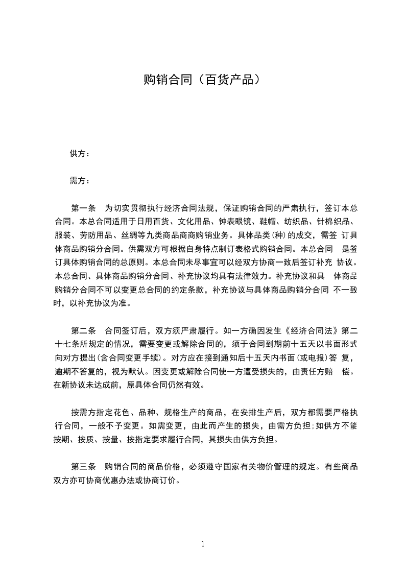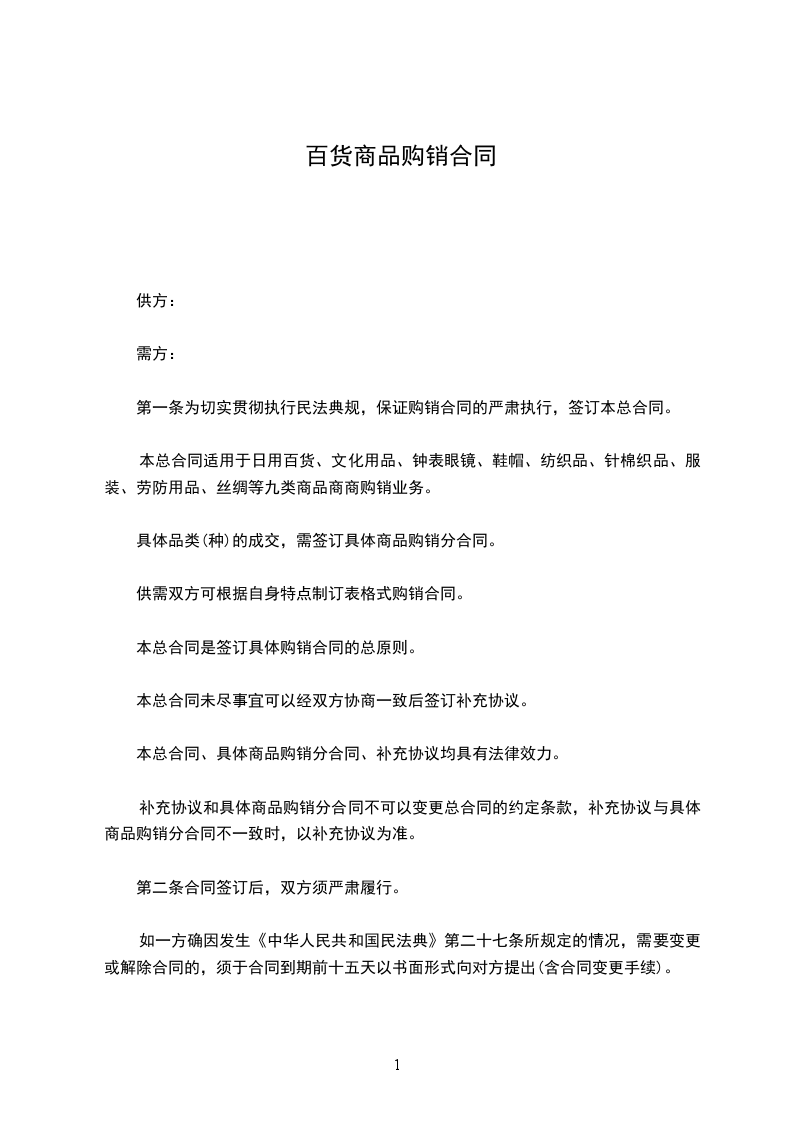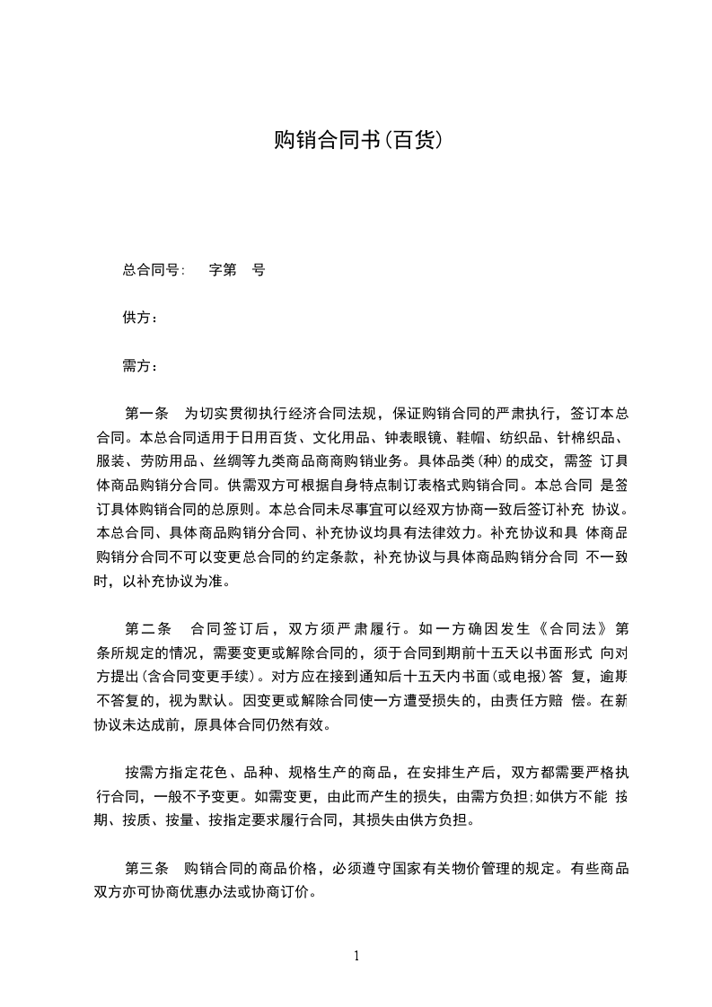 第一条 为切实贯彻执行经济合同法规,保证购销合同的严肃执行,签订本总 合同。本总合同适用于日用百货、文化用品、钟表眼镜、鞋帽、纺织品、针棉织品、 服装、劳防用品、丝绸等九类商品商商购销业务。具体品类(种)的成交,需签 订具体商品购销分合同。供需双方可根据自身特点制订表格式购销合同。本总合同 是签订具体购销合同的总原则。本总合同未尽事宜可以经双方协商一致后签订补充 协议。本总合同、具体商品购销分合同、补充协议均具有法律效力。补充协议和具 体商品购销分合同不可以变更总合同的约定条款,补充协议与具体商品购销分合同 不一致时,以补充协议为准。