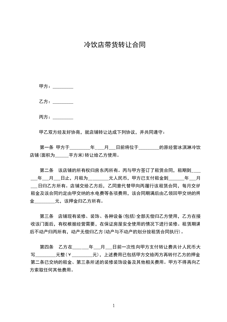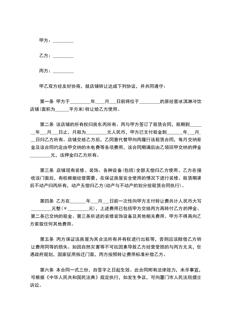 甲、乙、丙三方经友好协商,就店铺转让事宜达成以下协议: