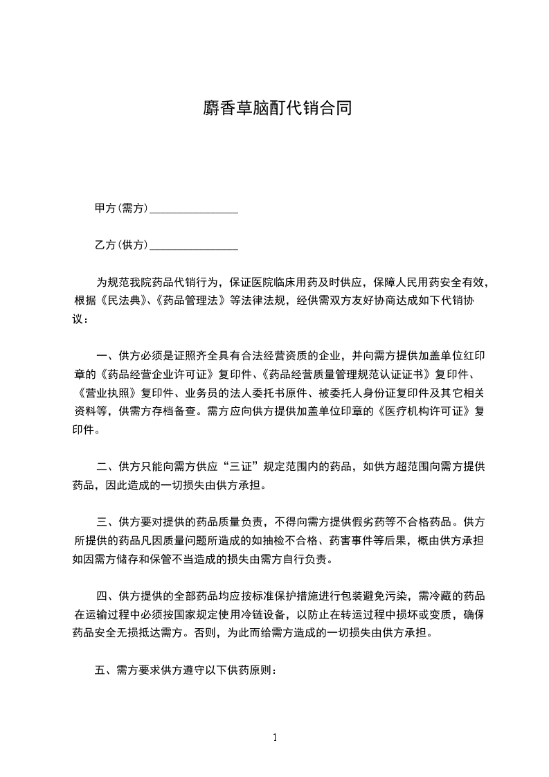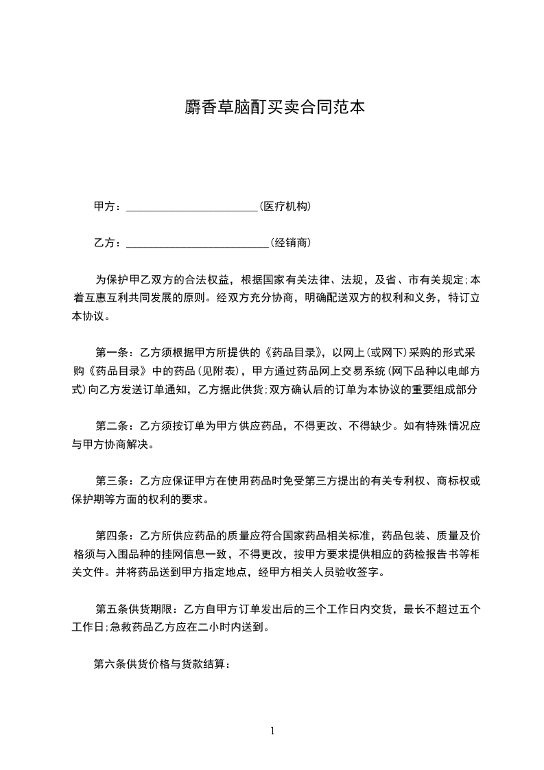 第二条:乙方须按订单为甲方供应药品,不得更改、不得缺少。如有特殊情况应与甲方协商解决。