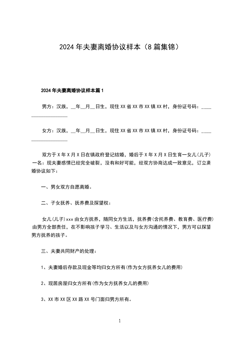 2024年夫妻离婚协议样本篇1