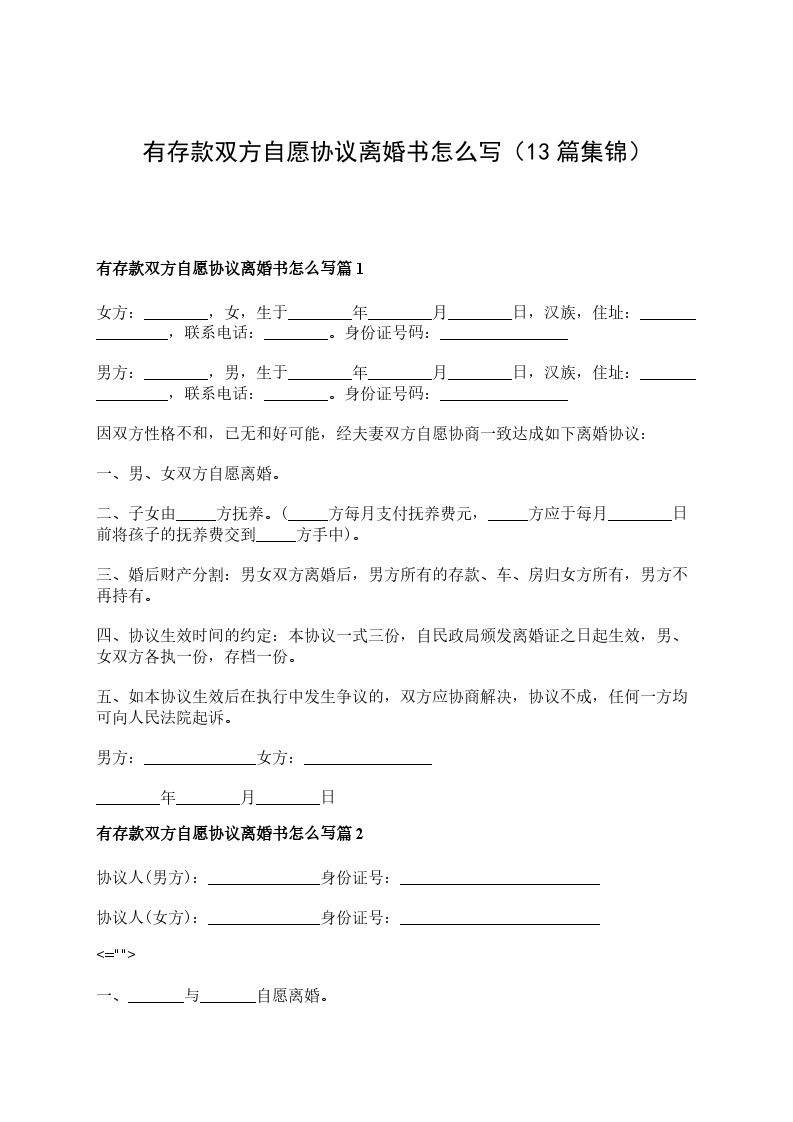 ⑴存款:双方名下现有银行存款共_元,双方各分一半,为_____元。分配方式:各自名下的存款保持不变,但男方/女方应于_____年___月___日前一次性支付_____元给女方/男方。