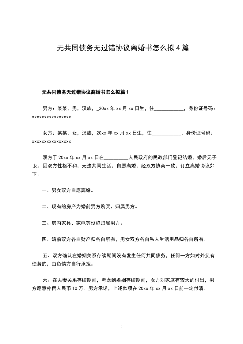 无共同债务无过错协议离婚书怎么拟篇4
