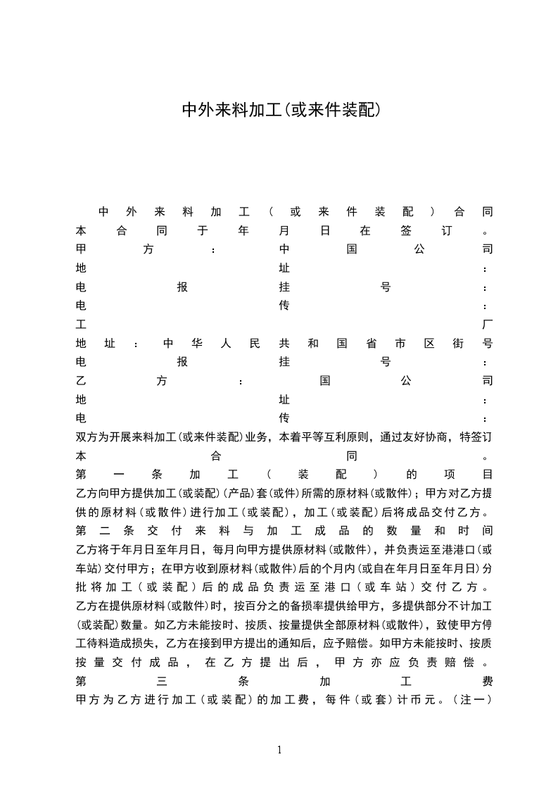 中外来料加工(或来件装配)合同