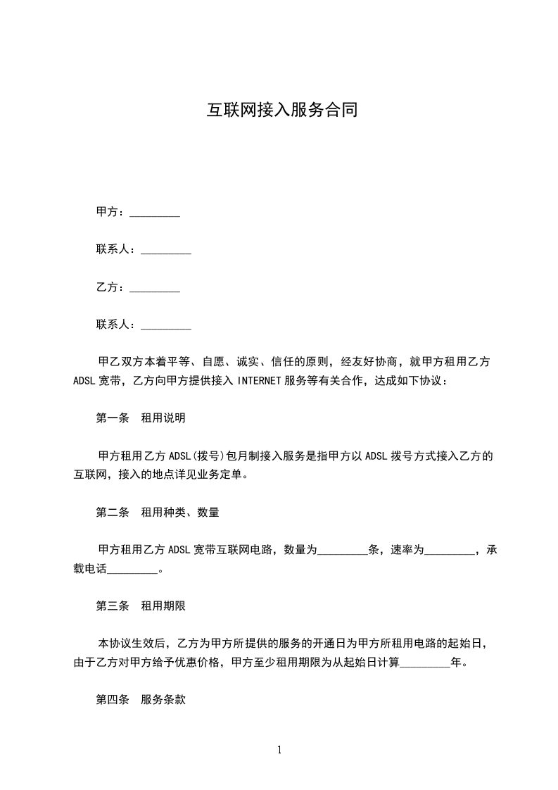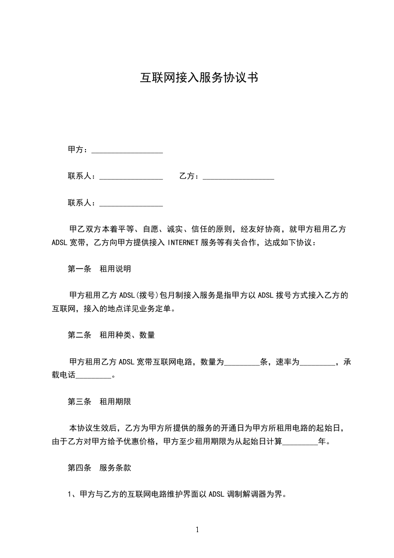 甲乙双方本着平等、自愿、诚实、信任的原则,经友好协商,就甲方租用乙方ADSL宽带,乙方向甲方提供接入INTERNET服务等有关合作,达成如下协议: