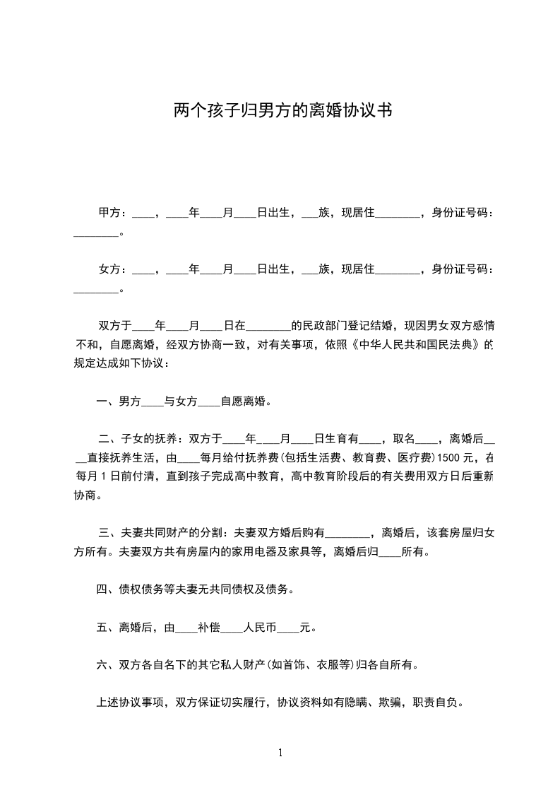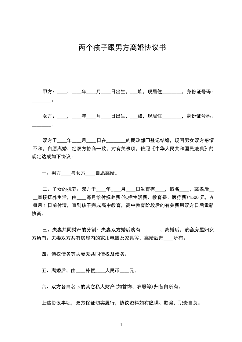 二、子女的抚养:双方于____年____月____日生育有____,取名____,离婚后____直接抚养生活,由____每月给付抚养费(包括生活费、教育费、医疗费)1500元,在每月1日前付清,直到孩子完成高中教育,高中教育阶段后的有关费用双方日后重新协商。