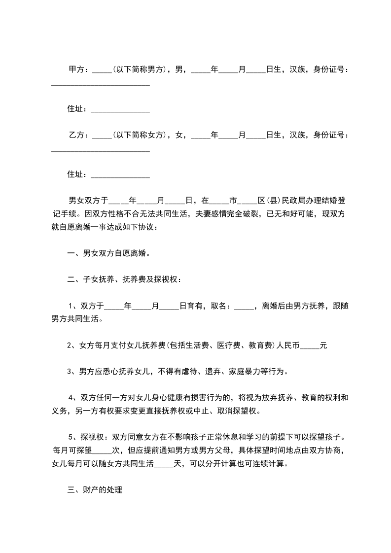 (本协议一式三份,当事人双方各执一份,交婚姻登记机关存档备案一份)