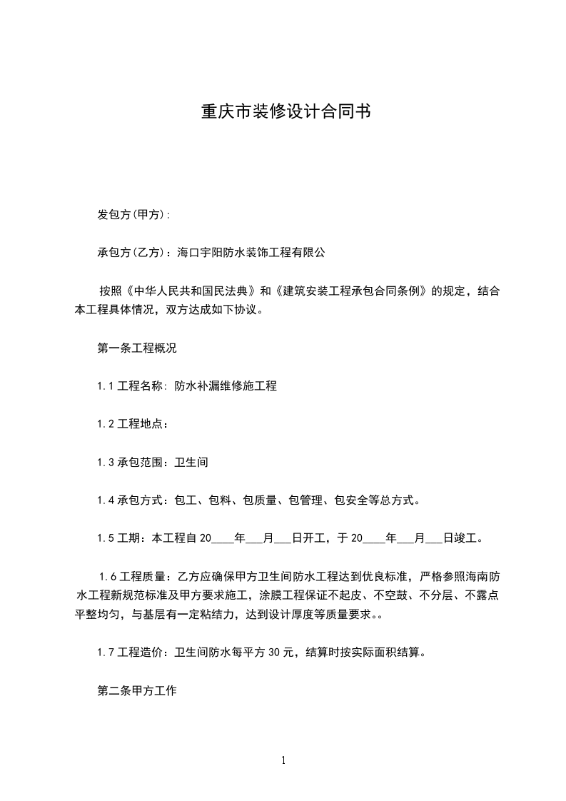 1.7工程造价:卫生间防水每平方30元,结算时按实际面积结算。