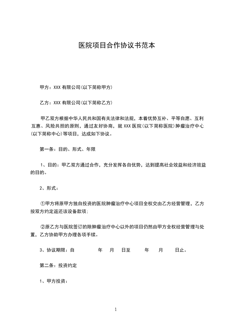 甲乙双方根据中华人民共和国有关法律和法规,本着优势互补、平等自愿、互利互惠、风险共担的原则,通过友好协商,就XXX医院(以下简称医院)肿瘤治疗中心(以下简称中心)等项目,达成如下协议。