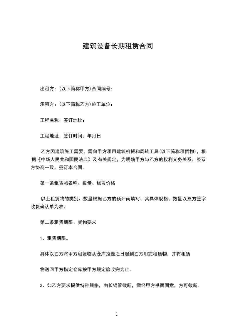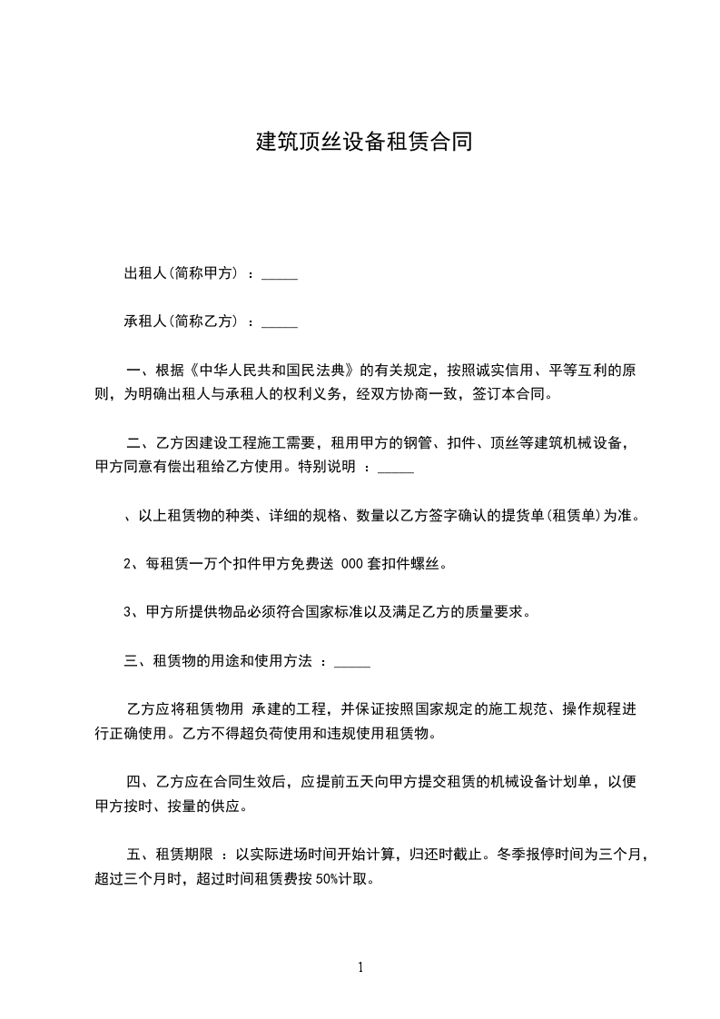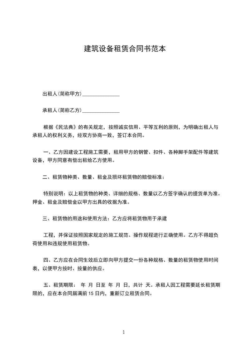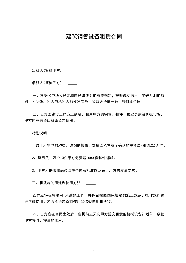 一、乙方因建设工程施工需要,租用甲方的钢管、扣件、各种脚手架配件等建筑设备,甲方同意有偿出租给乙方使用。