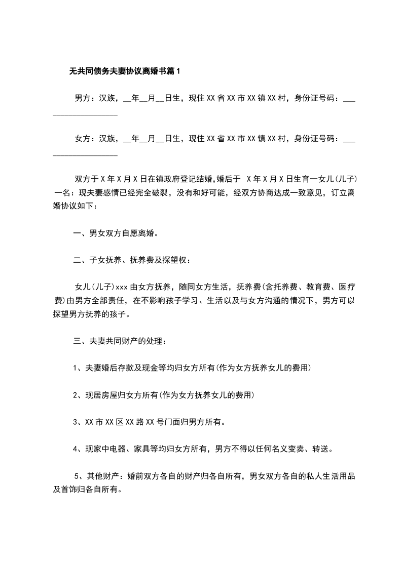 无共同债务夫妻协议离婚书篇6