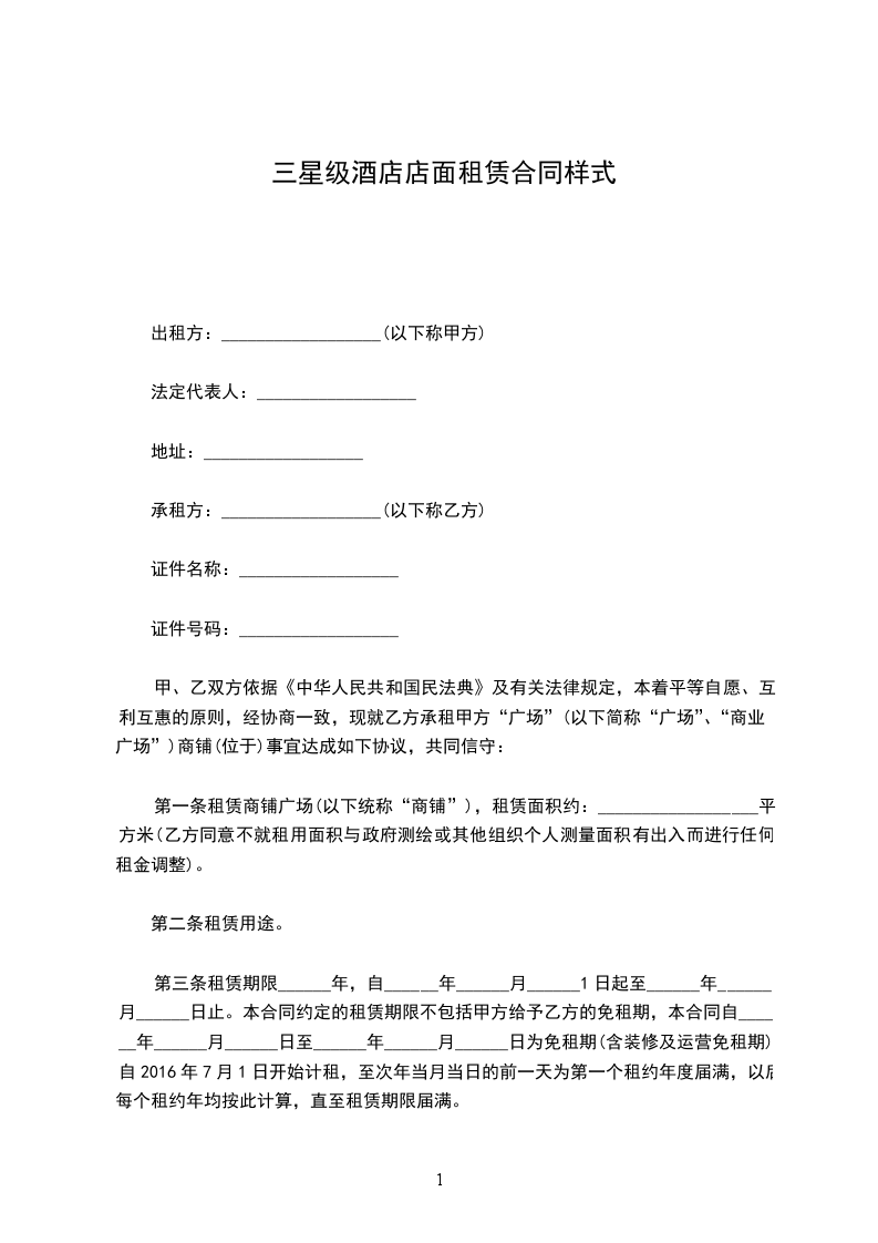 第三条租赁期限______年,自______年______月______1日起至______年______月______日止。本合同约定的租赁期限不包括甲方给予乙方的免租期,本合同自______年______月______日至______年______月______日为免租期(含装修及运营免租期),自2024年7月1日开始计租,至次年当月当日的前一天为第一个租约年度届满,以后每个租约年均按此计算,直至租赁期限届满。