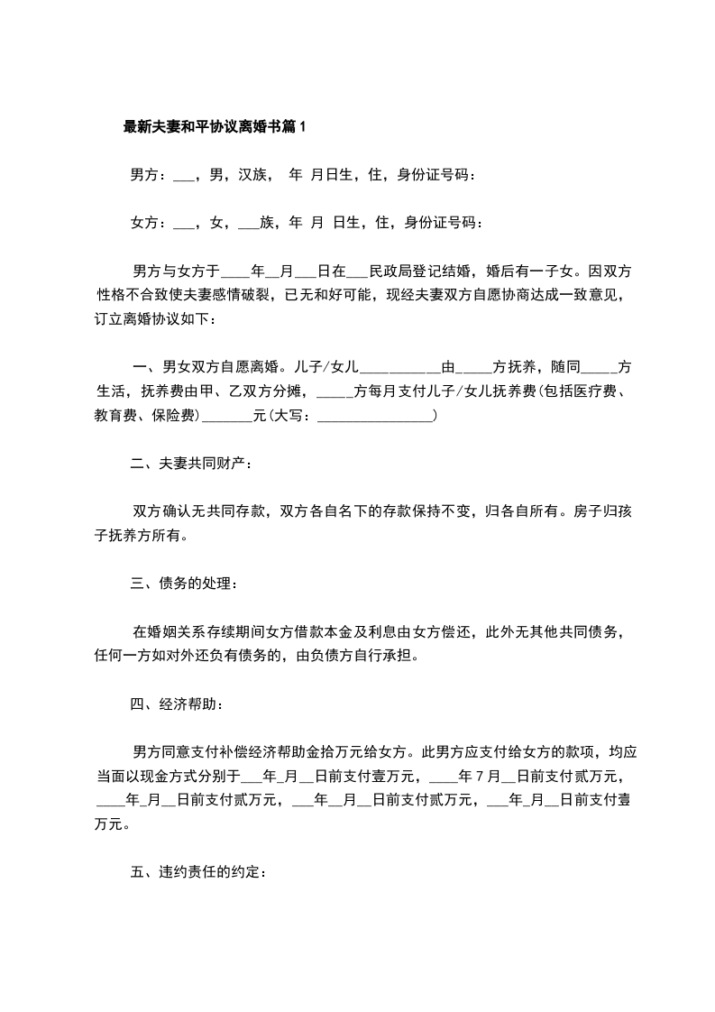 最新夫妻和平协议离婚书模板篇5