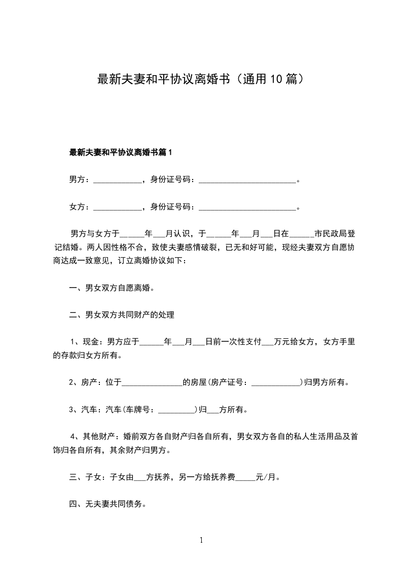 最新夫妻和平协议离婚书模板篇10