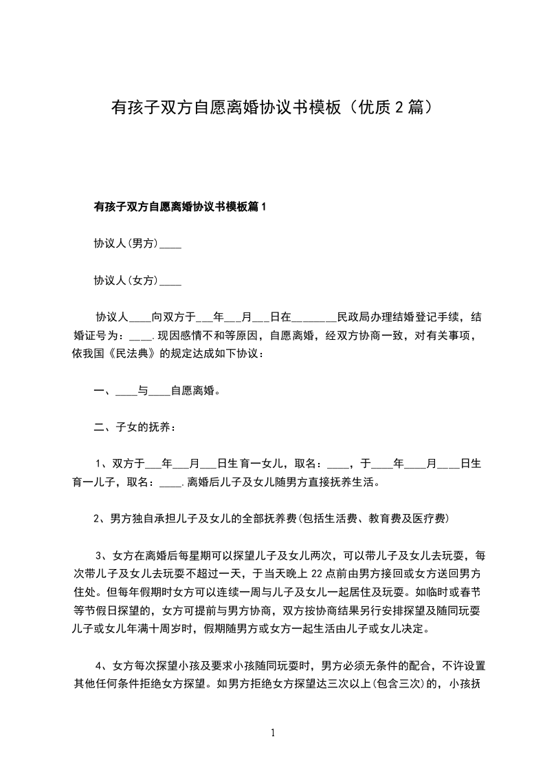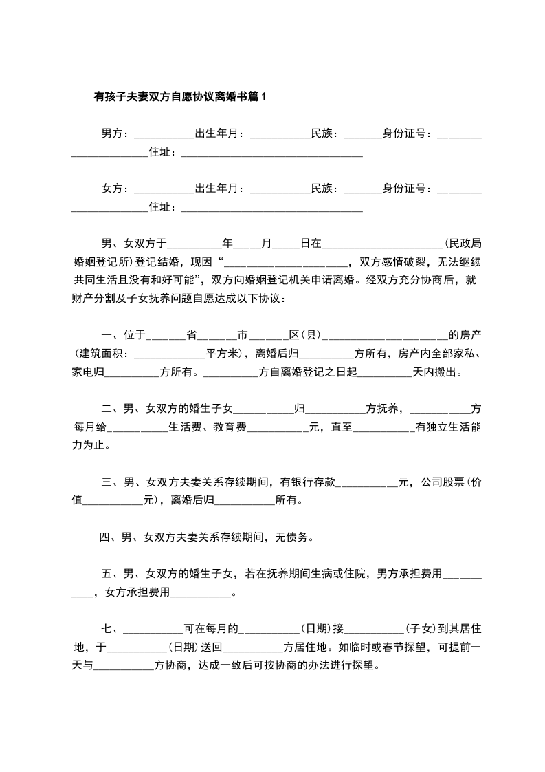 有孩子双方自愿离婚协议参考格式篇1