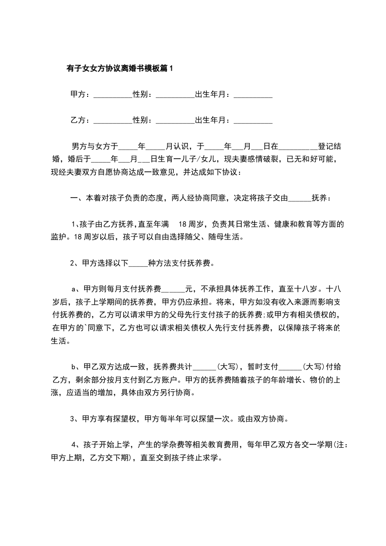 (1) 方应当向有子女抚养权一方支付违约金__元。