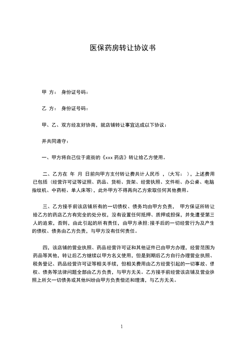 一、甲方将自己位于底街的《xxx药店》转让给乙方使用。