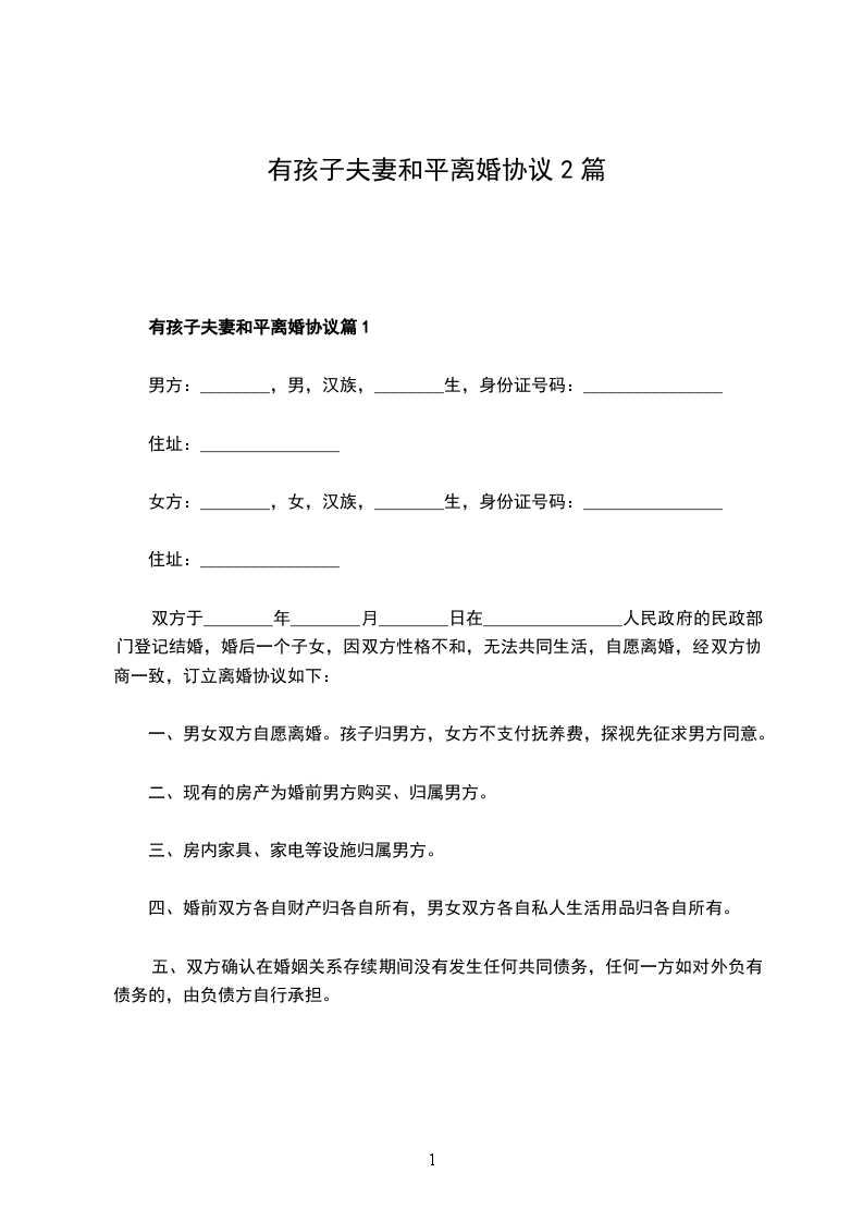 有孩子夫妻和平离婚协议篇1