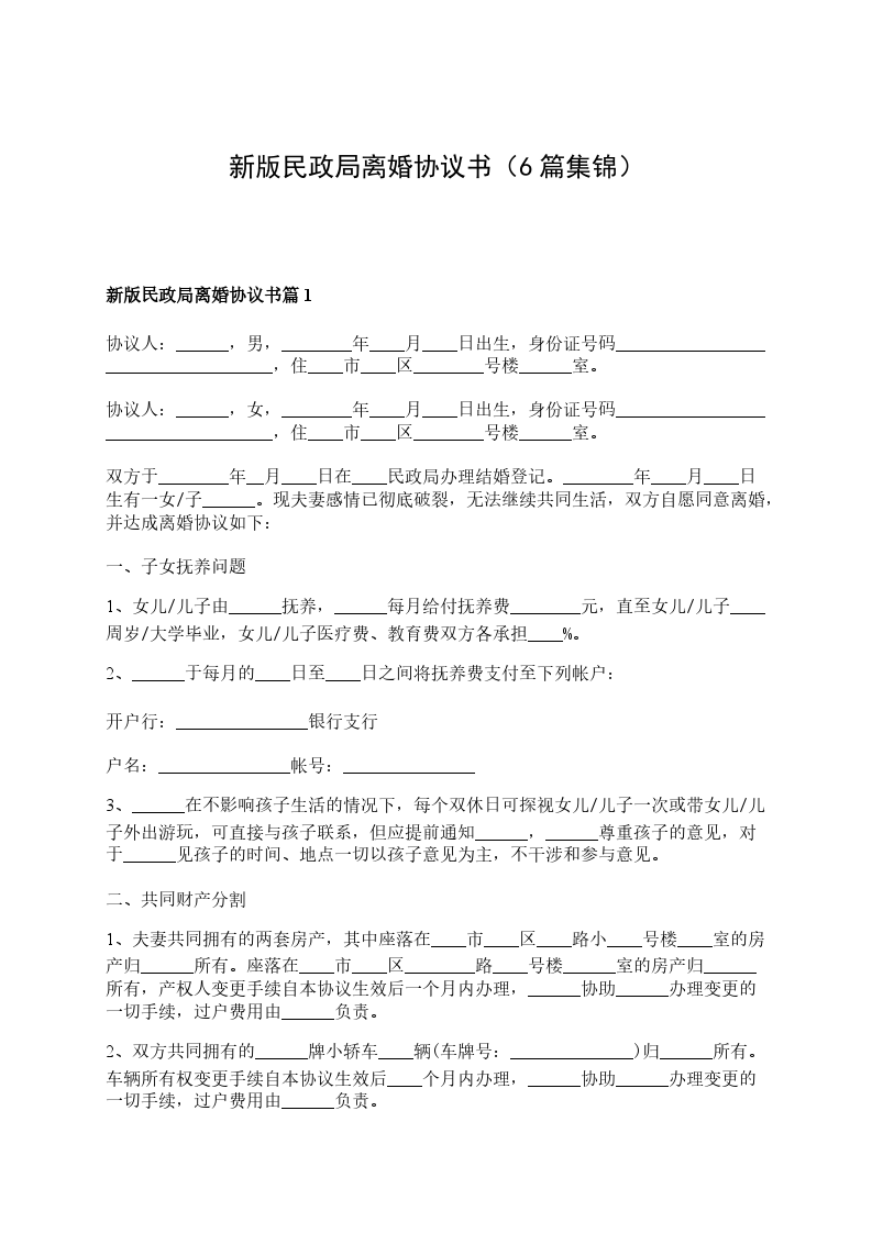 协议人双方于_______年_______月_______日登记结婚,_______年_______月_______日生育一子,取名_______。现协议双方夫妻感情确已完全破裂,经双方协商一致,自愿离婚、财产分割及子女抚养事宜达成如下协议: