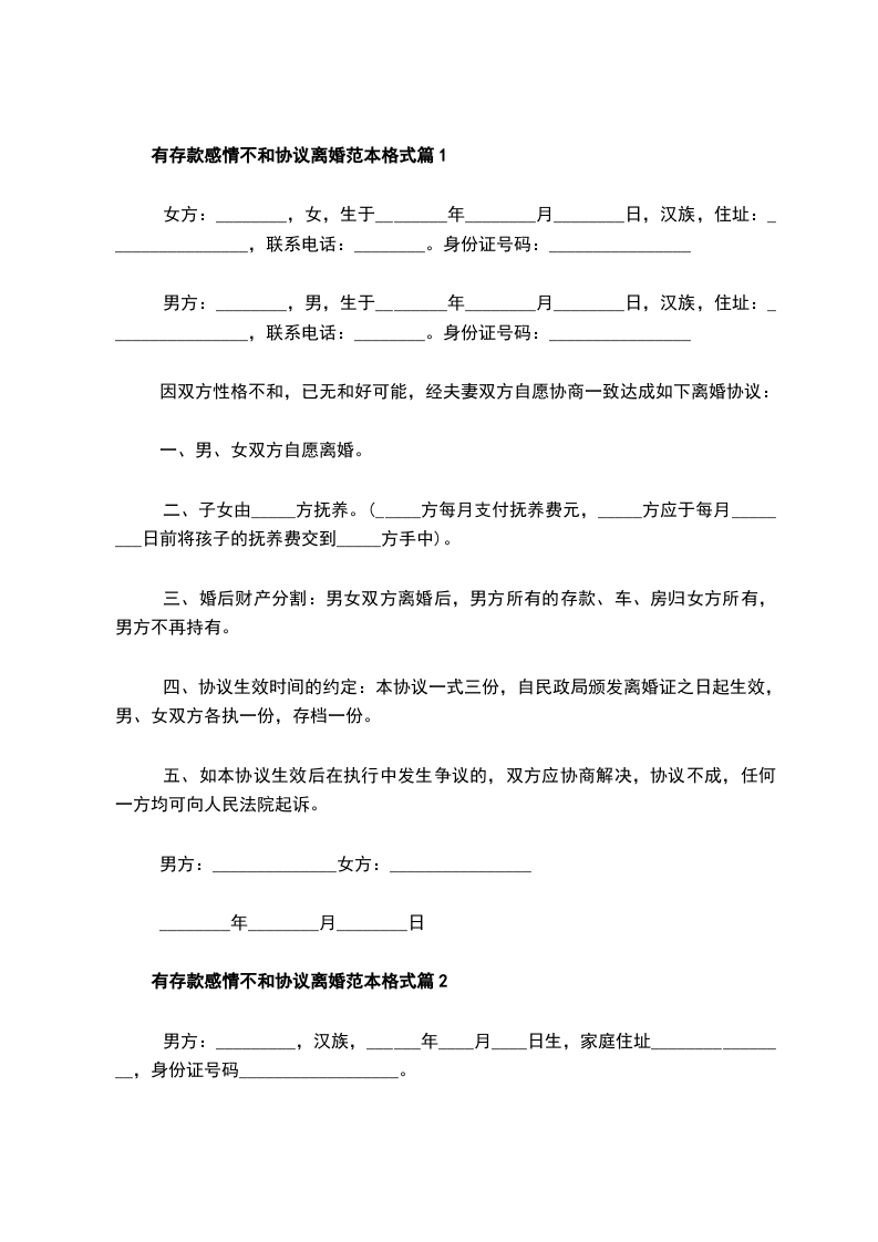 有存款感情不和协议离婚书模板篇2