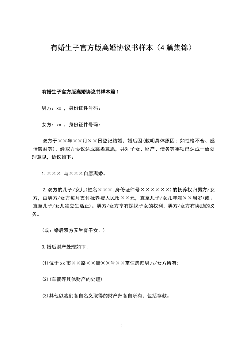 有婚生子官方版离婚协议书样本篇1