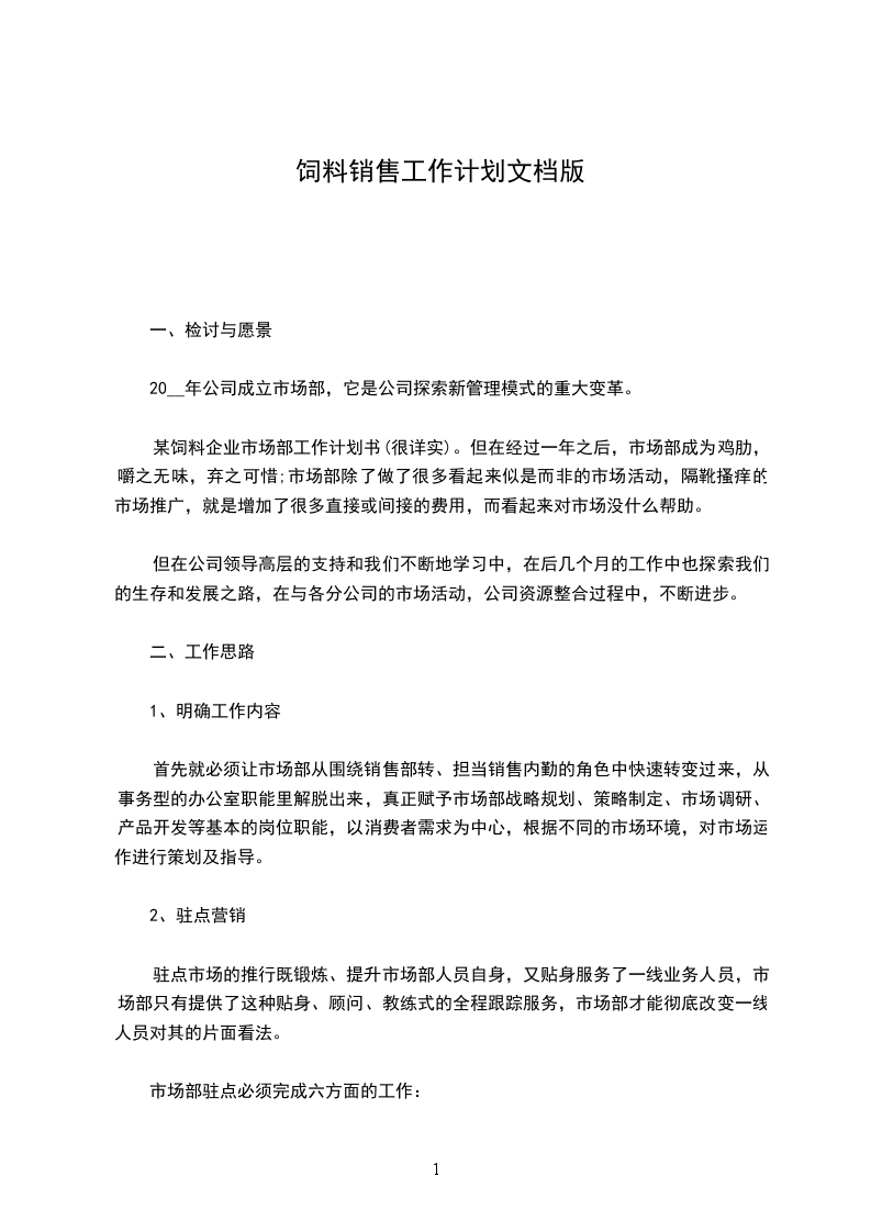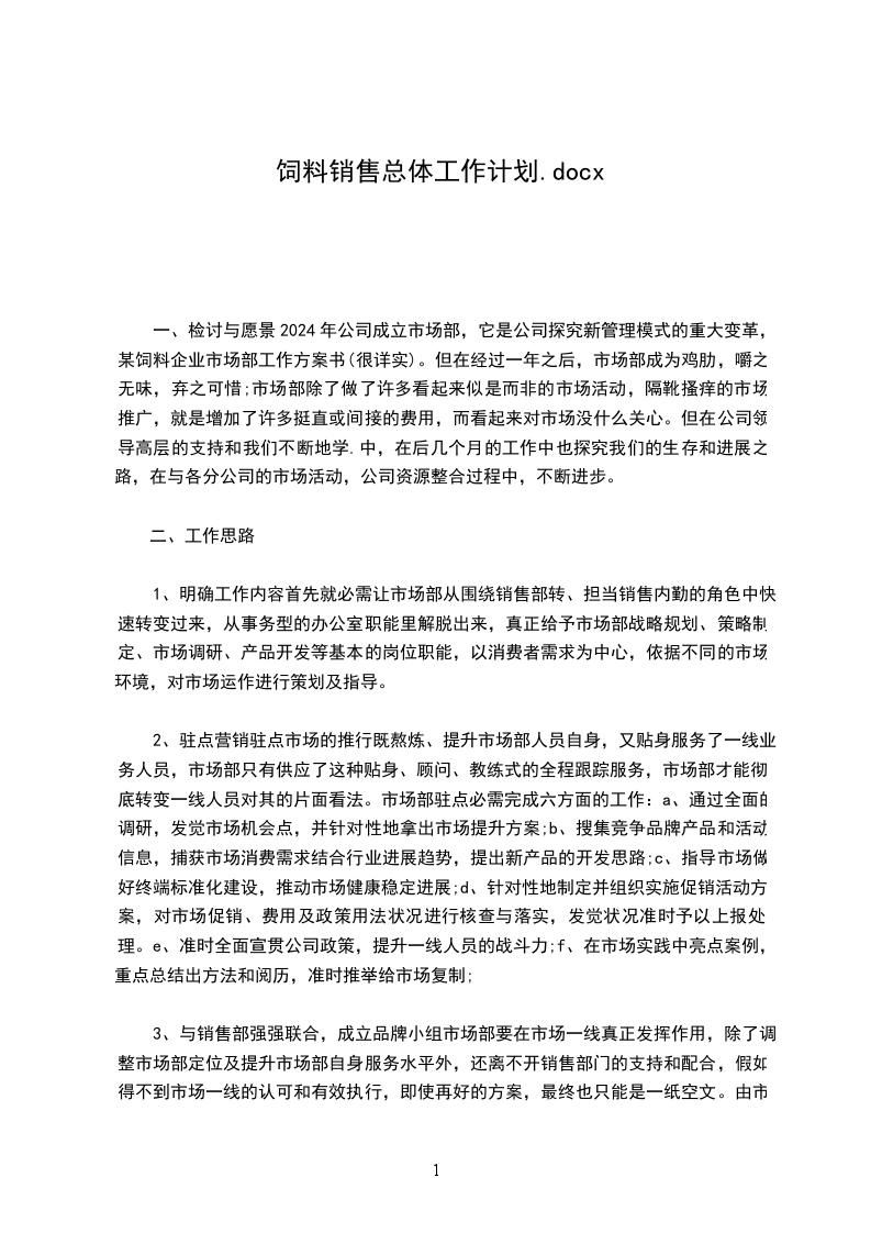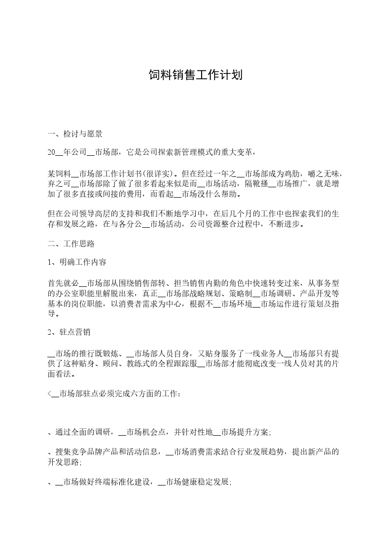 某饲料__市场部工作计划书(很详实)。但在经过一年之__市场部成为鸡肋,嚼之无味,弃之可__市场部除了做了很多看起来似是而__市场活动,隔靴搔__市场推广,就是增加了很多直接或间接的费用,而看起__市场没什么帮助。