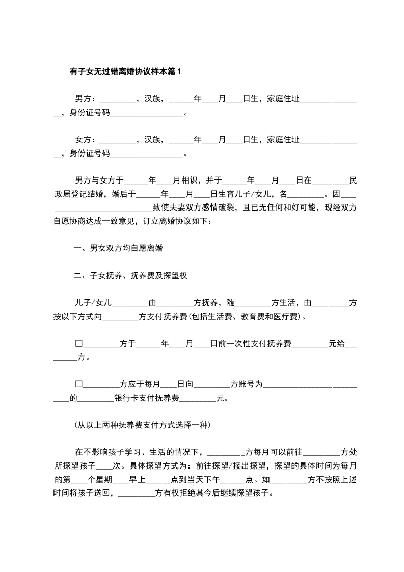 一、双方婚生子女___________由_______方抚养,_______方每月_______日前支付人民币___________元抚养费。_______方每月___________(日期)到_______方处接孩子探视,于___________(日期)之前送回_______方住处。