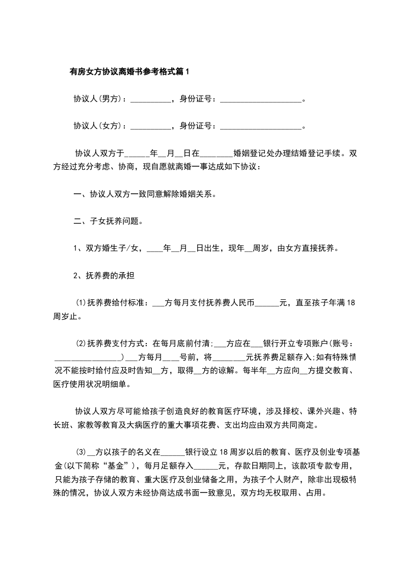 有房女方协议离婚书参考格式篇6