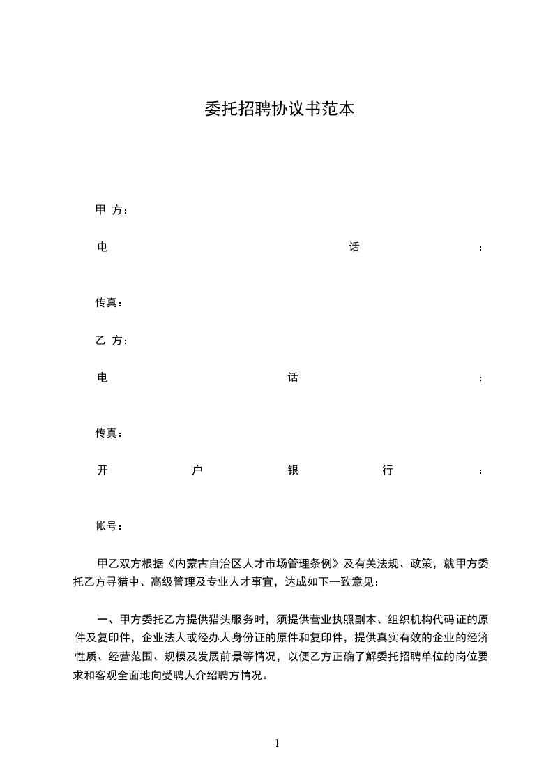 甲乙双方根据《内蒙古自治区人才市场管理条例》及有关法规、政策,就甲方委托乙方寻猎中、高级管理及专业人才事宜,达成如下一致意见: