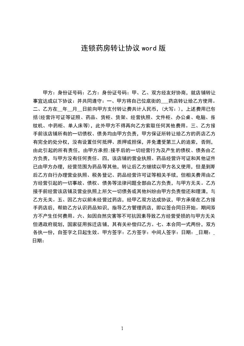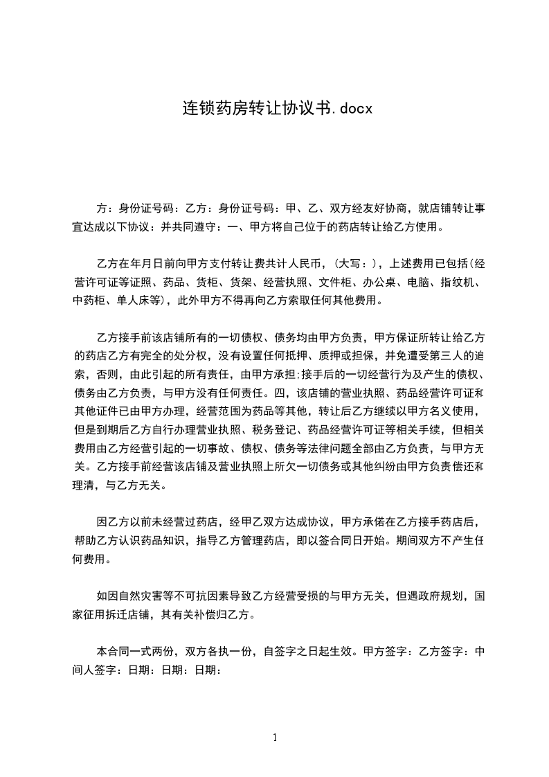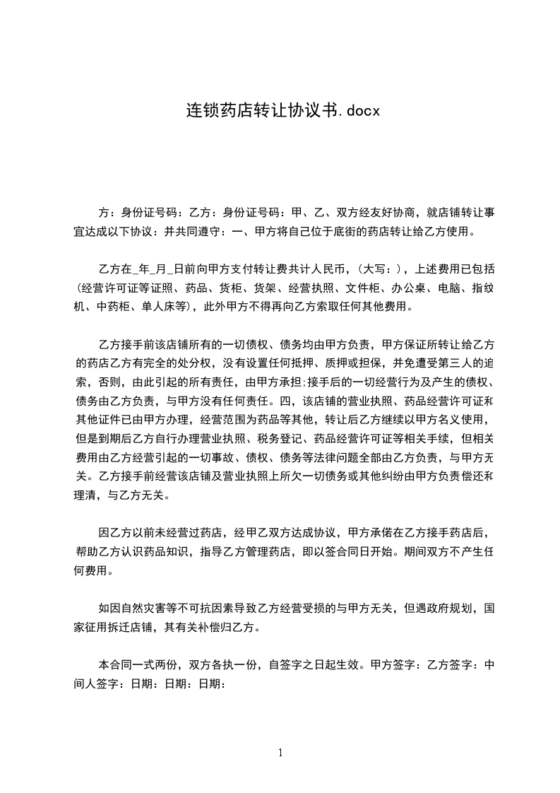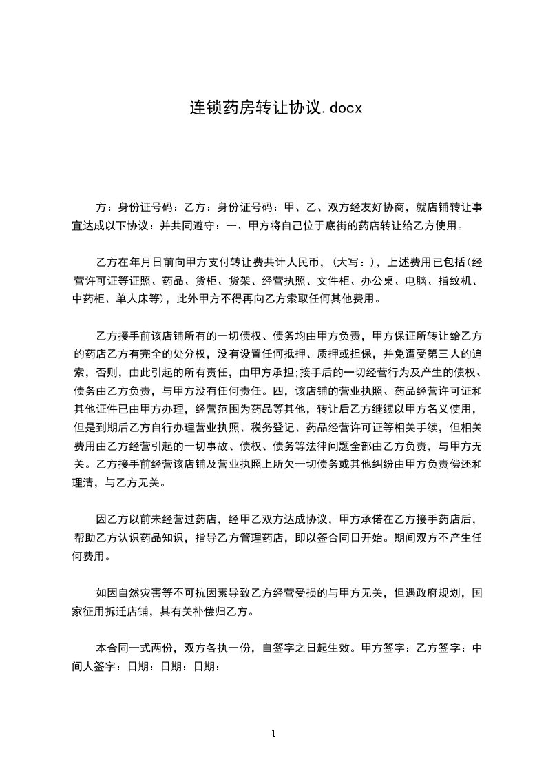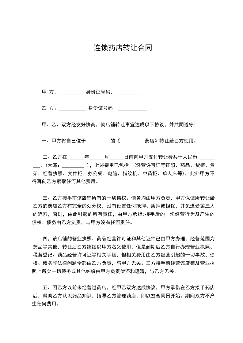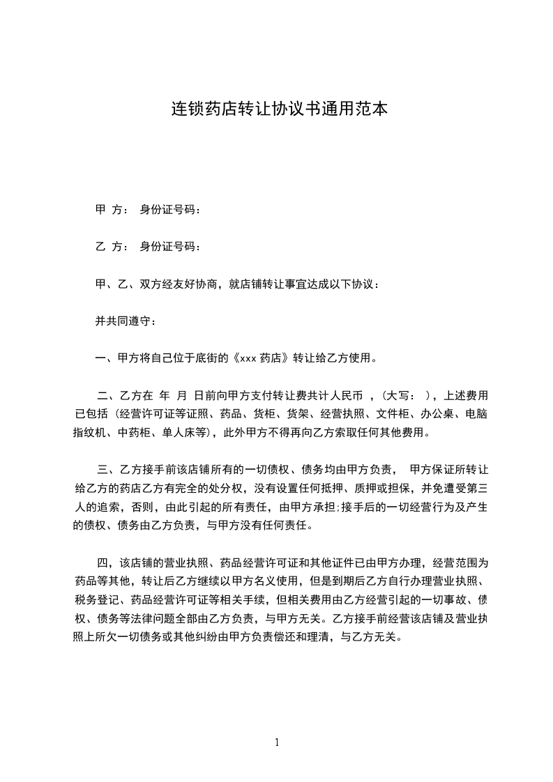 一、甲方将自己位于底街的《xxx药店》转让给乙方使用。