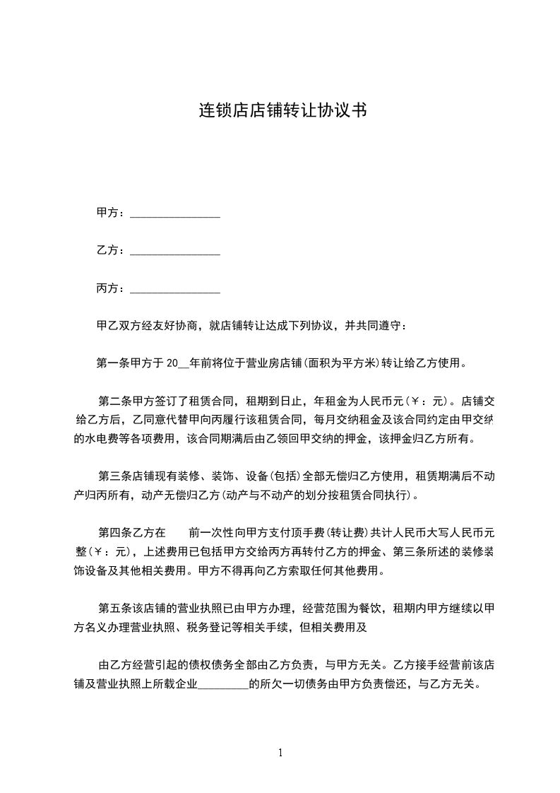 二、乙方在 年 月 日前向甲方支付转让费共计人民币 ,(大写: ),上述费用已包括 (经营许可证等证照、药品、货柜、货架、经营执照、文件柜、办公桌、电脑、指纹机、中药柜、单人床等),此外甲方不得再向乙方索取任何其他费用。