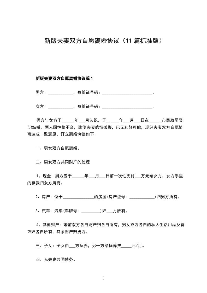新版夫妻双方自愿离婚协议篇1