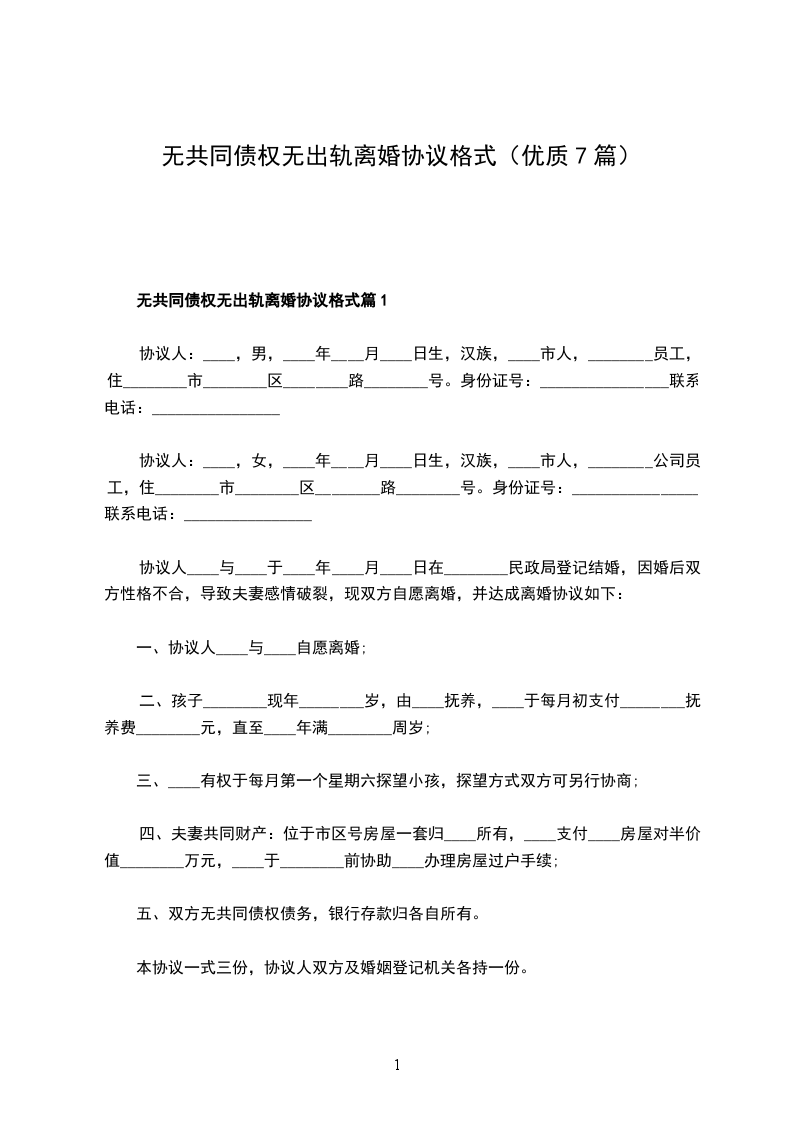 七、本协议一式三份,当事人双方各执一份,交婚姻登记机关存档备案一份。