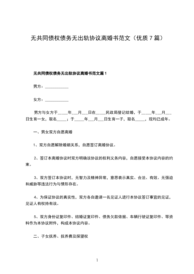 无共同债权债务离婚协议范文篇1