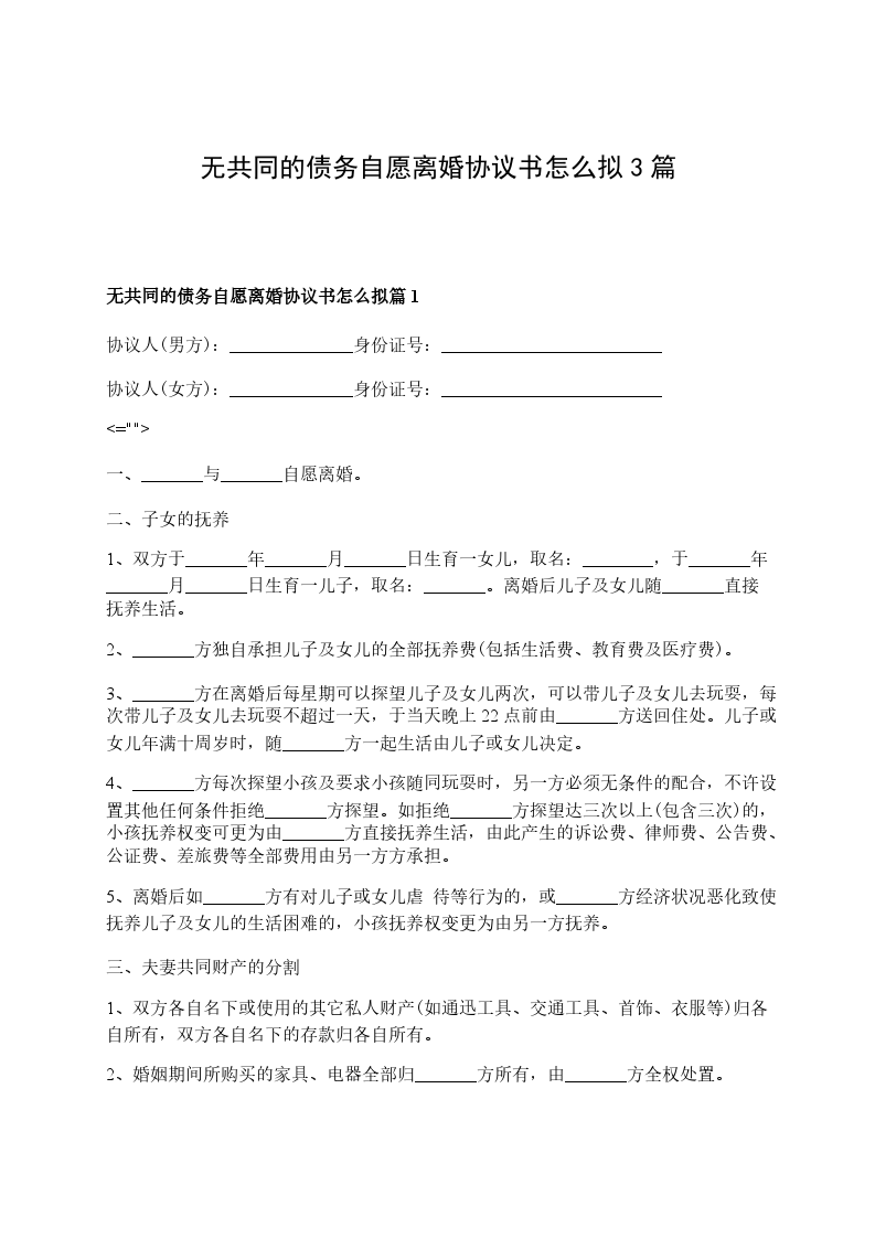 无共同的债务自愿离婚协议书怎么拟篇1