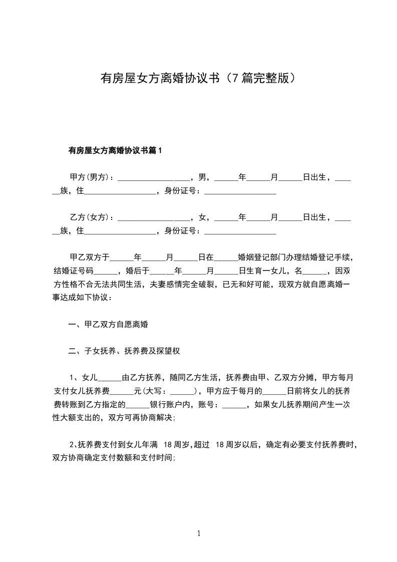 (1)夫妻婚后共有房屋坐落在__________________住房一套。现协商该套房产归______方所有,______方同意在办理完离婚手续后配合______方办理产权变更手续。